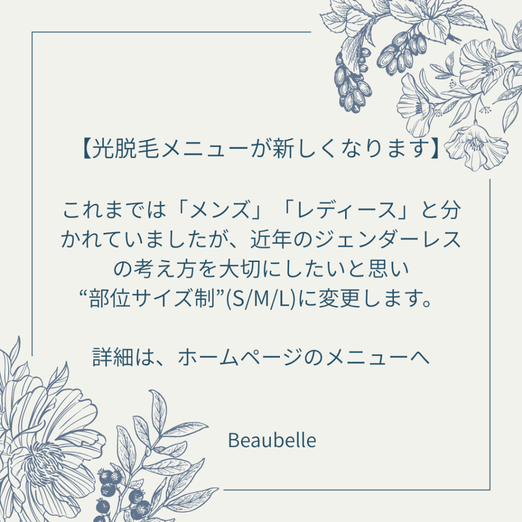 性別で分けていた価格から、照射箇所の面積や体格で、S/M/Lサイズとしての価格表記にしました✿