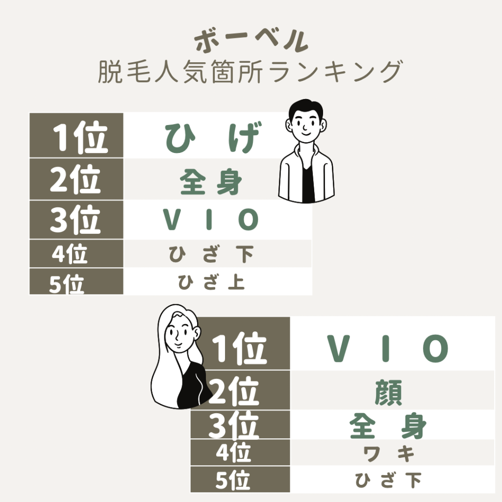 男女ともにトップ3は、順位は違えど同じ箇所ですね♡“ひげ・顔脱毛”は、肌もツルツルになって大人気です。女性の第4位の“ワキ脱毛”は、中高生に人気です。